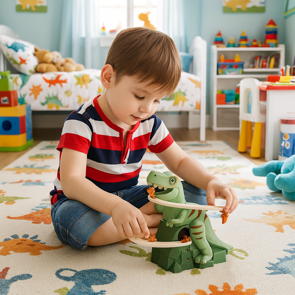 As children drop the figures and anticipate the ride, they practise timing and coordination. Tracking the movement, choosing which dino to send down, and redesigning the track encourage creativity and problem-solving. The dynamic motion holds attention — kids learn cause and effect, experiment with speed and angles, and refine their hand-eye coordination with every launch.