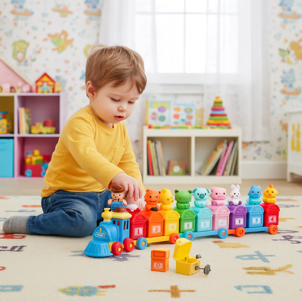 Each carriage on the train corresponds to a number, and with matching animals or number tiles, children learn to associate the numeral with quantity or symbol. Placing the correct number of animals or the right tile on each carriage helps reinforce number sense, counting skills and early arithmetic understanding. This type of manipulative learning encourages cognitive development in a natural, intuitive way.