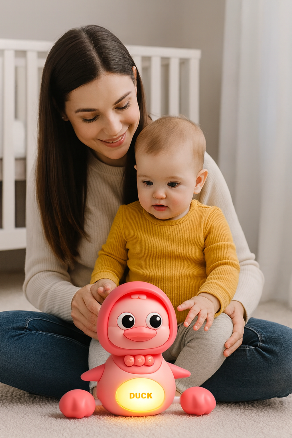 As kids pursue the ducks, they practice gross motor skills — crawling, walking, reaching — while strengthening coordination. The visual wobble and sound triggers help with visual tracking and auditory attention. Pushing or tapping the duck encourages hand control and cause-and-effect recognition: “I touch, it moves and quacks.”